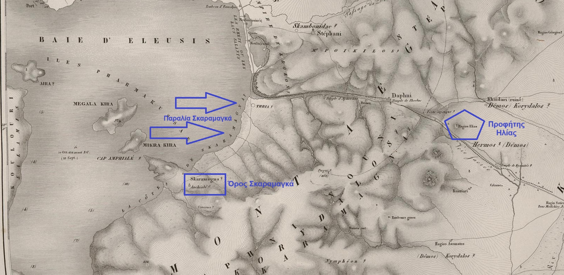ΒΑΣΙΚΗ ΓΕΩΓΡΑΦΙΚΗ ΕΝΗΜΕΡΩΣΗ: Όταν αναφερόμαστε στο τοποθεσία Σκαραμαγκά θα πρέπει να γνωρίζουμε ότι μιλάμε για μια παραθαλάσσια περιοχή στην οποία κατέληγε το Όρος Αιγάλεω (δεν υπήρχε τότε η Λ. Σχιστού όπως τη γνωρίζουμε στις μέρες μας). Σύμφωνα με τα δεδομένα που γνωρίζουμε και τους χάρτες που έχουμε στη διάθεσή μας, η περιοχή Σκαραμαγκάς “καταλάμβανε” σχεδόν όλο το παραθαλάσσιο μέτωπο από την Ιερά Οδό (σημερινή Λ.Αθηνών) μέχρι το Πέραμα, στην είσοδο του Κόλπου της Ελευσίνας. Ιδιαίτερα οι Χάρτες της Αττικής των E. Curtius και J. A. Kaupert, και Ferdinand Stademann (Panorama von Athen, 1841) την τοποθεσία Σκαραμαγκάς την αναφέρουν ως βουνό (Bergen von Skaramanga) και ξεχωριστά ως παραλία (Skaramanga).